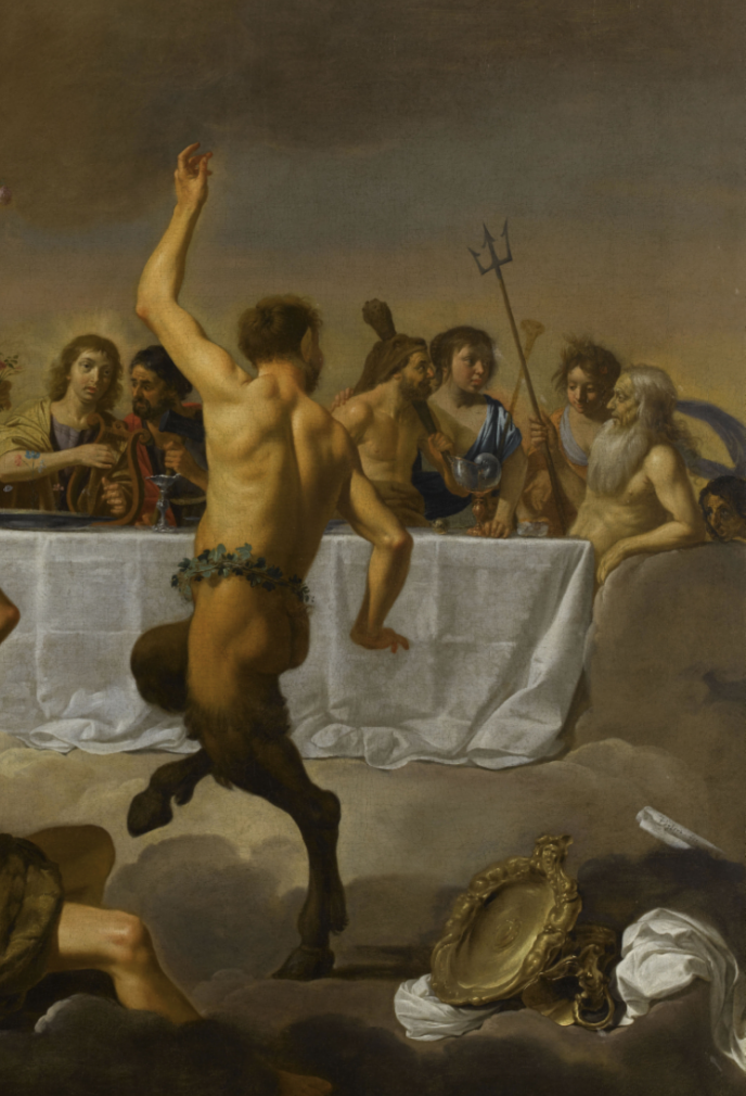 Others were quick to point out that if the tableau was a parody of anything, it was most likely of the painting The Feast of Gods by Dutch artist Jan Harmensz van Biliert partially pictured here. We were also reminded that the origin of the Olympics was a celebration of Greek gods of which Dionysus was one. I assume he was the figure in blue in the tableau. This figure was the god of wine-making, fertility, insanity, and ritual madness. So, there you go!
