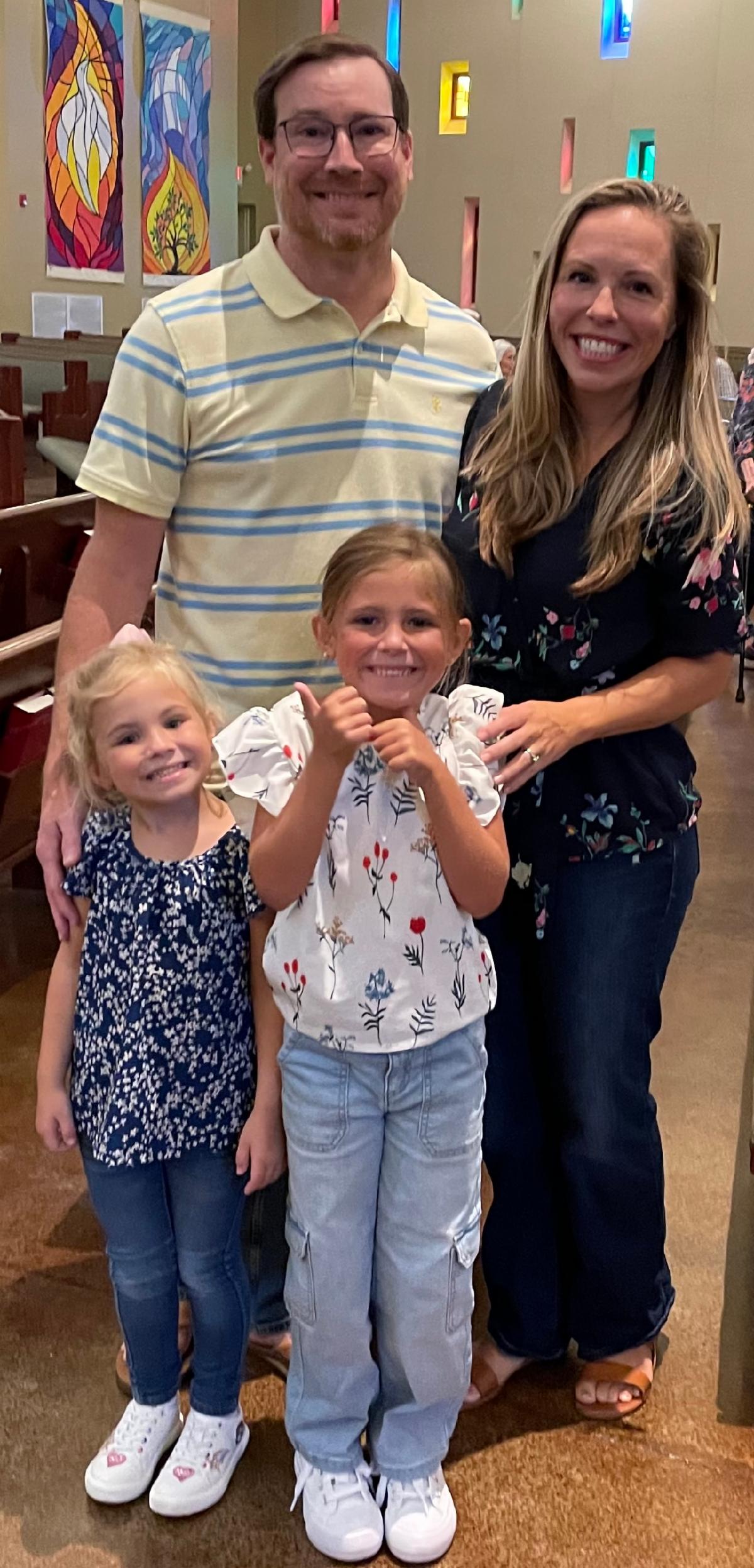 Tyler and Ryan Mears and their two daughters, Delaney and Dylan, sporting their jeans before worship. | |