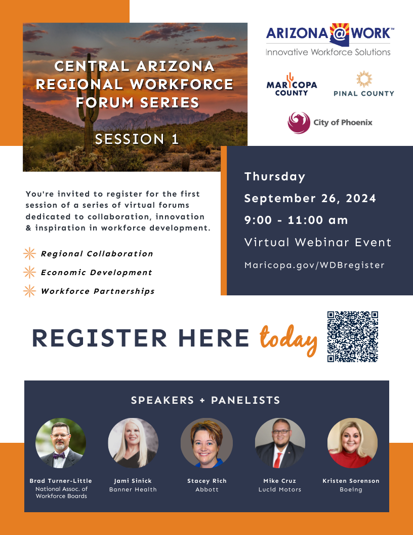The Pinal County, Maricopa County, and City of Phoenix workforce development boards (ARIZONA@WORK) invite you to register to attend the 2024 Central Arizona Regional Workforce Virtual Forum Series, which begins on Thursday, September 26, 2024. Attendees will hear presentations from the National Association of Workforce Boards (NAWB) and local business representatives on critical workforce and economic development topics. This event will be the first in a series of virtual online forums dedicated to strengthening and fostering workforce partnerships, regional collaboration, economic development, innovation, and inspiration. Further information is included in the flyer (right), including registration info, There is no cost to attend.