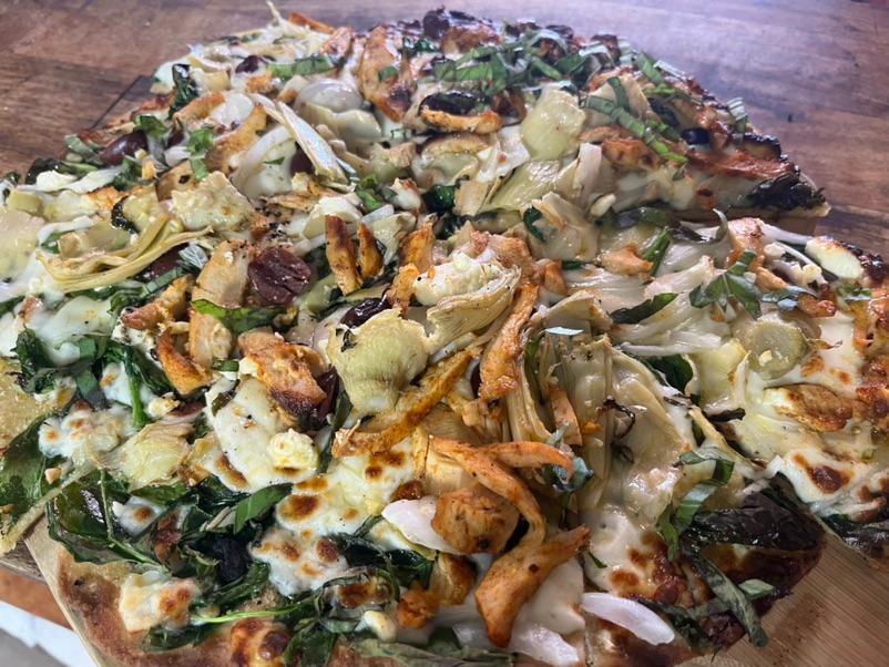 Mediterranean ~ Olive oil, mozzarella, spinach, roasted chicken, marinated artichokes, red onion, kalamata olives and dusting of feta $22