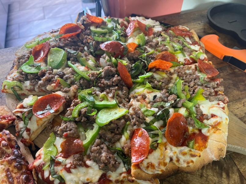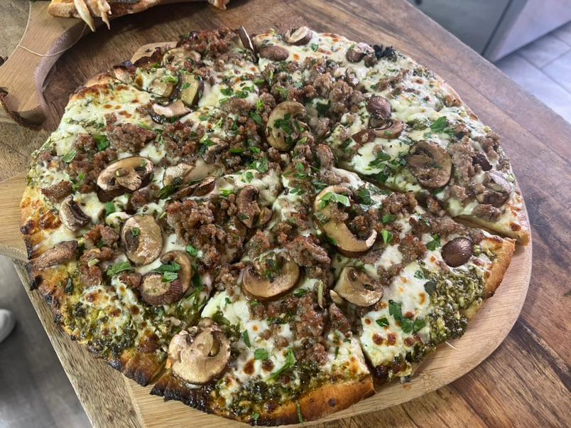 Tomboni’s Italian ~ Basil pesto, mozzarella, Italian sausage, kalamata olives $20