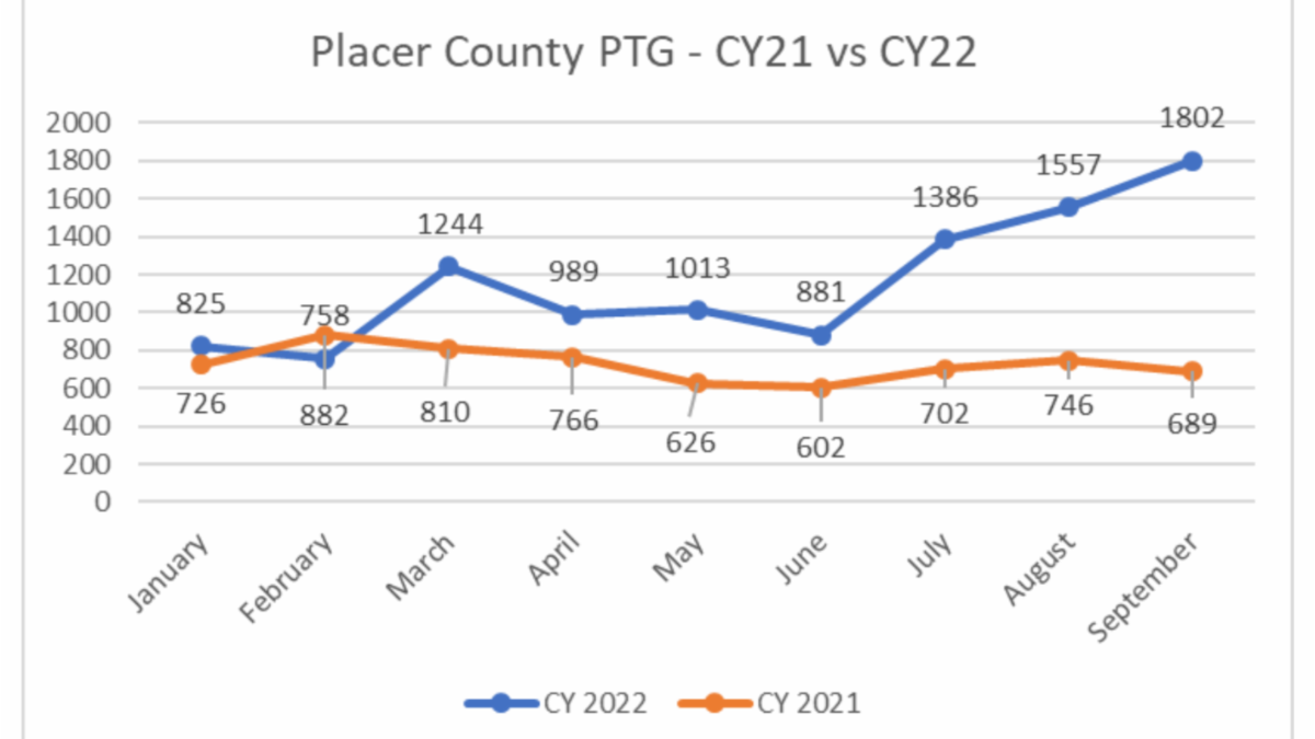 The graph shows households per month at Placer County mobile distributions in calendar year 2021 vs this year (2022). | |