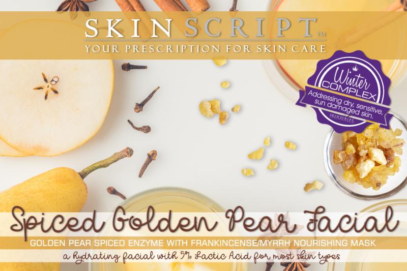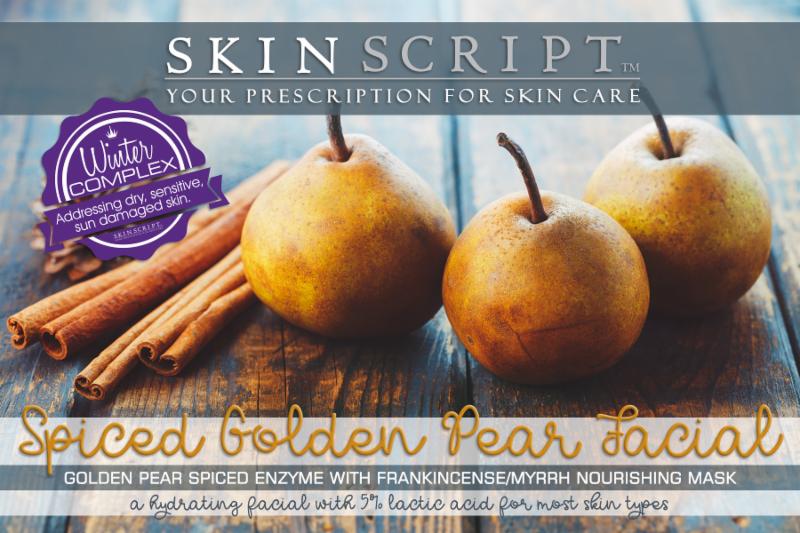 Holiday memories come to life through spicy scents of the holidays. This Pear and Frankincense Facial is designed to relax us, yet hydrate our skin with 5% Lactic and all the benefits of the Winter Complex including the use of (1) the DermaPep peptide with retinoic effects to stimulate collagen and reduce photo-damage, (2) the ayurvedic plant Indian Senna to hydrate dry skin, and (3) the Mirabilis Jalapa Flower to soothe sensitive skin. We also incorporated Pinolumin which is a concentrated extract of Swiss stone pine (trees) that calms skin hypersensitivity and reduces skin redness.