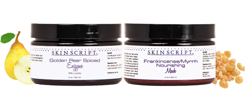 Purchase the Spiced Golden Pear Facial Duo, which includes one 4 oz. Golden Pear Spiced Enzyme and one 4 oz. Frankincense/Myrrh Nourishing Mask and receive a 10% discount! Our Spiced Golden Pear Facial Package includes a protocol and two 4"x 6" display photos, all in a gold organza bag.