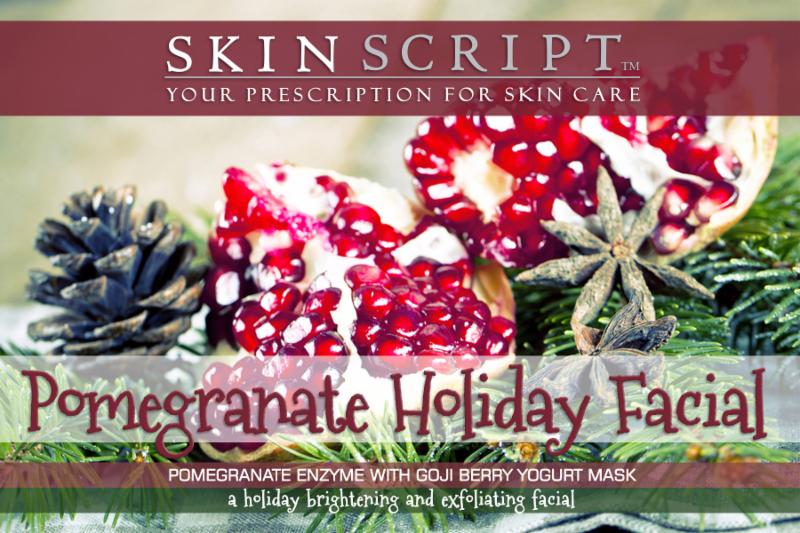 This holiday season, treat your skin to a Pomegranate Holiday Facial. Pomegranate provides the perfect comforting warmth and aroma while leaving skin smooth and bright. Witch hazel calms skin from the harsh effects of winter weather and yogurt moisturizes to soothe dryness. May your holidays be merry and bright! This blend of pomegranates, goji berries and yogurt creates the perfect potion for all skin types. A blend of lactic and salicylic acid dissolves dead skin cells revealing a soft complexion. Witch hazel improves skin tone and calms the skin while pomegranate enzyme brings the skin back to life!