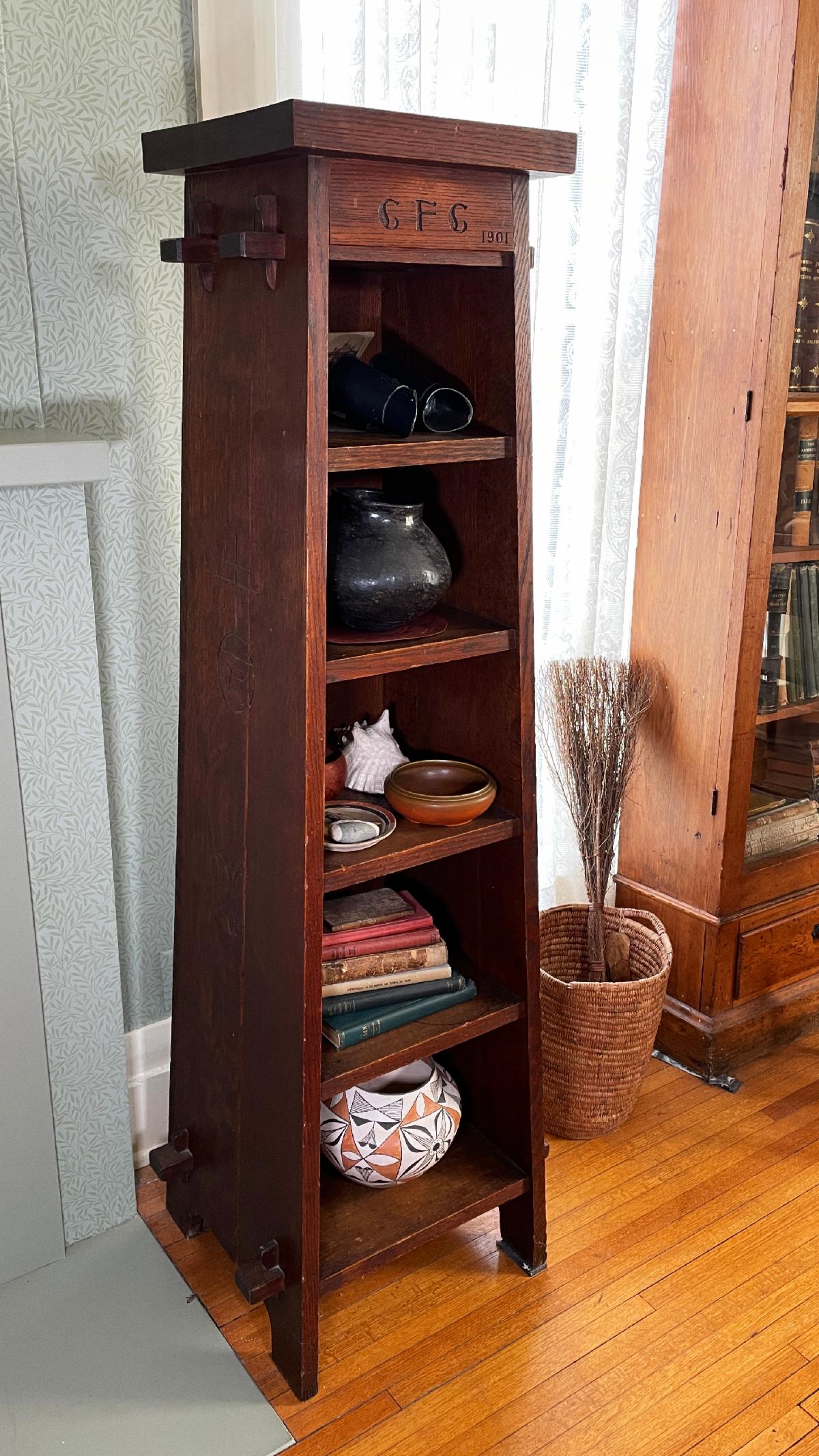 Magazine Pedestal Stand, c. 1908-15 by Roycroft. White oak wood. Gift of David L. Shugart. In the permanent collection, Farm House Museum, University Museums, Iowa State University, Ames Iowa.