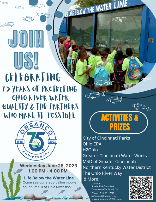 (Cincinnati, OH) On June 28th, the Ohio River Valley Water Sanitation Commission (ORSANCO) is celebrating its 75th anniversary with an outdoor community event of local partners to be held at the City of Cincinnati’s Smale Riverfront Park from 1pm-4pm. The celebration kicks off with a press event at 1:30pm; Ohio EPA Director, Cincinnati Vice Mayor, Northern Kentucky Water District CEO/President, Greater Cincinnati Water Works Interim Director, and The Metropolitan Sewer District of Greater Cincinnati Director will join ORSANCO’s Executive Director to share their experience partnering across state lines with the common goal of improving and protecting the water quality of the Ohio River and interstate waters of the Ohio River Basin. ORSANCO will have their 2,200-gallon Life Below the Water Line mobile aquarium on display full of Ohio River fish, plus the opportunity to enjoy games and activities. Everyone is welcome and encouraged to attend to learn more about the valuable resources of the Ohio River and the people who work hard to protect it.
