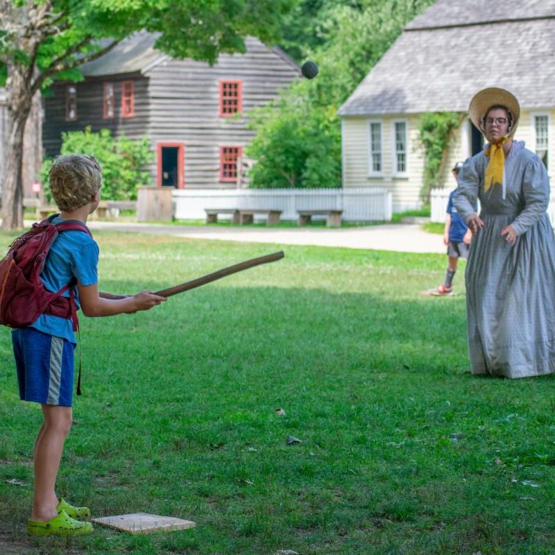 Baseball and BBQ occurring on Friday, June 28th – Sunday, June 30th visitors will learn about the history of baseball and be able to step up to bat. The menu at Bullard Tavern will include items from the grill and in the Scoop Shop ice cream will be served. There will be opportunities to play classic early American games on the Common, meet and greet our sheep, chickens, cattle, and pigs, and learn about summer in 19th-century New England. To cool off, be sure to stop by Ox & Yoke Café for a seasonal special of ice-cold strawberry lemonade. To purchase tickets for Baseball and BBQ, please visit https://www.osv.org/event/baseball-and-bbq/.