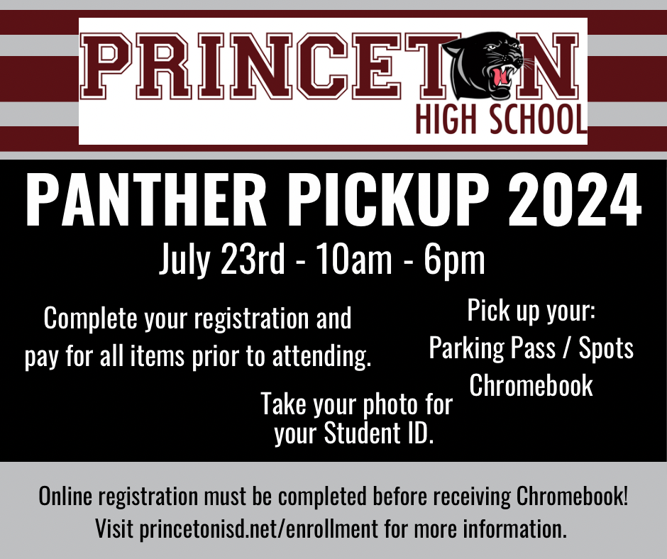 Panther Pickup at PHS will be from 10 a.m.-6 p.m. July 23. This will be a time for students to pick up Chromebooks, take a picture for IDs, get a parking pass, etc. Schedules will be available on Infinite Campus. Students will need to login to access schedules; however, the schedules are still subject to change. Printed schedules will not be available until the first day of school.