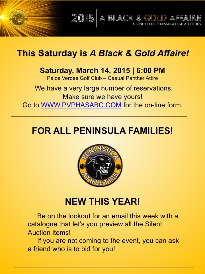 Thank you Peninsula High community for your support of this Saturday's Black and Gold Affaire. Your generosity is unbelievable and greatly appreciated by our student athletes. Thank you to all those who have worked so hard to make this year's event the "best ever." I am looking forward to a fun evening.