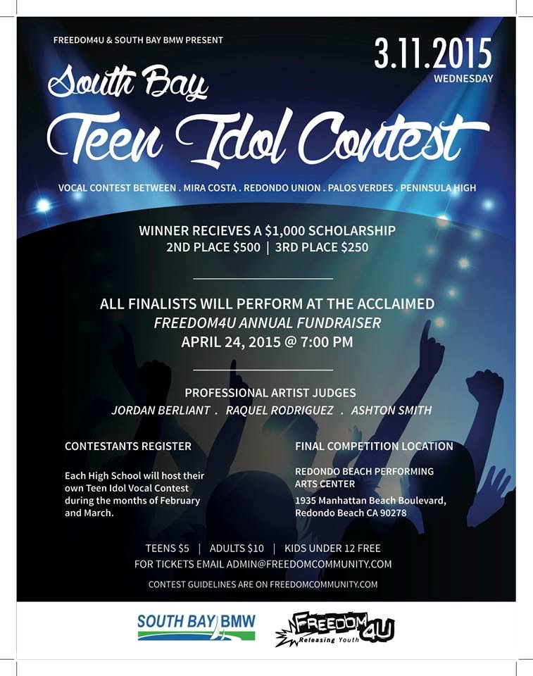 Zoe Council, Carina Kan, Rebecca Mu are the three winners of the Peninsula High Idol Contest sponsored by Freedom4U. Come cheer your Peninsula Idols to victory on March 11, at 7:30 at the Redondo Beach Performing Arts Center. See me if you need tickets.