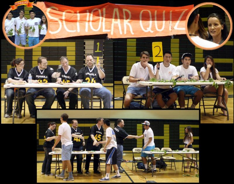 Thank you to Peninsula High English teacher Sandi Sidella for making this year's Scholar Quiz a wonderful celebration of knowledge and healthy competition. It came down to student team, "Anti Smelly Trees" and teacher team, "Apollo" before a packed gym during Friday's extended lunch. Halfway through the competition, the teachers were up by 30 points and the faculty was feeling pretty confident that their team would win, when suddenly the student team surged with a strong finish. Congratulations to Apollo members, Mark Greenberg, Don Frazier, Jade Garnet and Adam Garnet and AST members, Eric Mendez, Jamie Lee, Braeden Benedict and Ryan Landeza. I can't wait for next year!