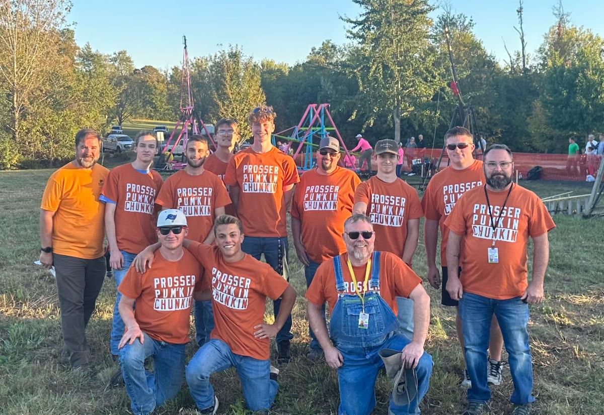 9 teams competed at Purdue Polytechnic New Albany to "chunk" pumpkins up to 100 yards all in the name of science! Each team was to construct a trebuchet that could stand up to the challenge! Prosser's own Automation and Robotics class competed and came out on TOP! They even collaborated with Construction Trades, Precision Machining, and Welding to create their award winning trebuchet by each class bringing their own unique skills sets and talents to the table. Their design was built with materials purchased thanks to the generous donations of their sponsors: RNDR Medical, GLOBE, Midwest Medical Works, Inc., CEPEDA, Full Circle Automation, TG Missouri, PACO, Fred Smith, and the New Albany Floyd County Education Foundation. Read more about the annual Harvest Homecoming competition in the article below.