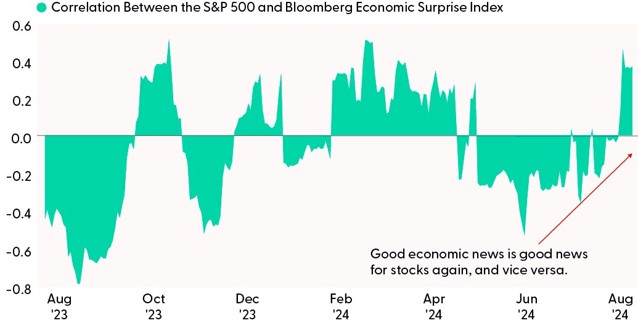 As you may notice, the correlation between the market and the economy has recently turned decisively positive. Previously, downside surprises on the economic calendar typically led to a positive response from equity markets, as underwhelming data was translated into higher probabilities for rate cuts. However, bad economic news can only be good news to stocks for so long. As we witnessed over the last week, weak manufacturing and employment data stoked recession fears, and investors responded by selling stocks. In contrast, Thursday’s better-than-expected jobless claims data helped alleviate labor market concerns and underpinned a sizable rally for the S&P 500.