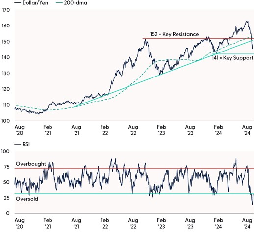 Is the unwinding of the carry trade over? Determining the size of the carry trade can be challenging due to the opaqueness of currency positioning and leveraged transactions. For example, analysts speculate yen carry-trade borrowing could range anywhere from $1 to $4 trillion in total, with recent reports estimating that 75% of carry trades have now been closed. Regardless, the path of least resistance for the dollar/yen is no longer higher, implying risk for additional downside volatility is elevated. Technical analysis provides a framework for assessing this risk, and a close below support at 141 would point to another potential leg lower for the pair. In contrast, a rally back above 152 would recapture the 200-dma and prior uptrend, suggesting reduced carry trade volatility and downside risk.