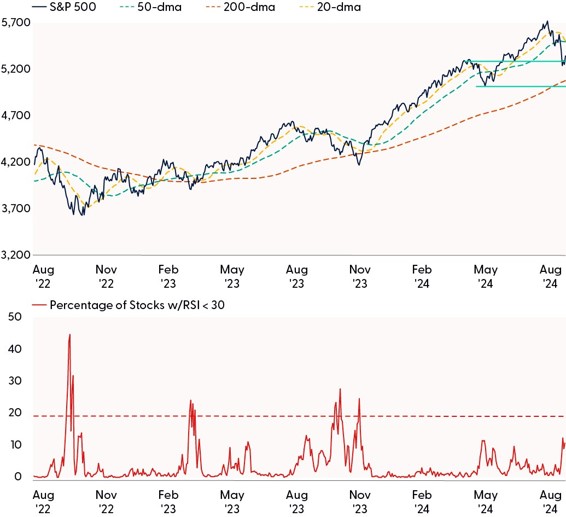 Like a stubbed toe, pullbacks in the market are inevitable, something investors tend to forget during periods of low volatility. When they occur, they tend to be painful and spark fear over something breaking. The market narrative often shifts during these periods as waning optimism manifests into panic, an emotion evident on the CBOE Volatility Index (VIX) last week. The VIX or ‘fear gauge’ surged to its highest reading since March 2020 on August 5 (a rising VIX is associated with increased fear and uncertainty in the market, and vice versa for a falling VIX). We view this move — and its subsequent decline — as a constructive sign, as major spikes in the VIX often overlap near capitulation points in equity markets.