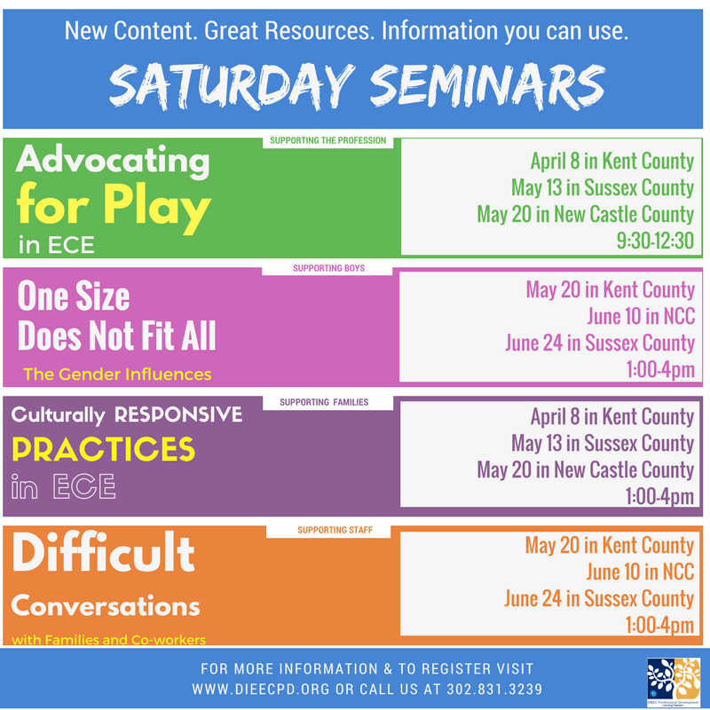 DIEEC PD can think of no better way to celebrate in April and beyond, than to register for Saturday seminars. Take advantage of this low cost training opportunity and learn ways to advocate for your profession and gain resources to support families, children and staff. Add tools to your tool-box and take home useful resources to use on Monday. As a gift to you for attending, and in celebration of WOYC, participants will be entered to win a toy or book for his or her classroom.