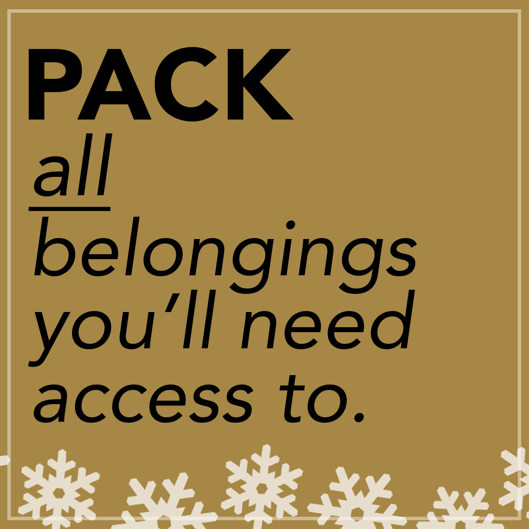 PACK all belongings you’ll need access to during the break, as well as all valuables.
