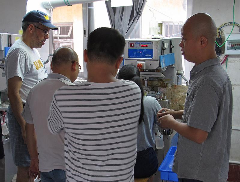 Discussing tampo printing with Mr Li and the guys at the Rapido factory. If you watched our video then you'll know that Mr Li has been working with us for ten years now!