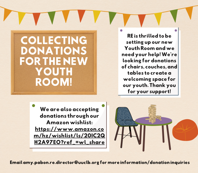 UUCLB RE is excited to announce an exciting new project aimed at enriching the lives of our youth: the creation of a dedicated Youth Room for RE. This space will provide a safe, engaging environment where young people can gather, learn, and grow together. To bring this vision to life, we are reaching out to our valued community for support. We are seeking donations of large tables, chairs, and beanbags. If you have items to contribute, please send pictures to amy.pabon.re.director@uuclb.org.