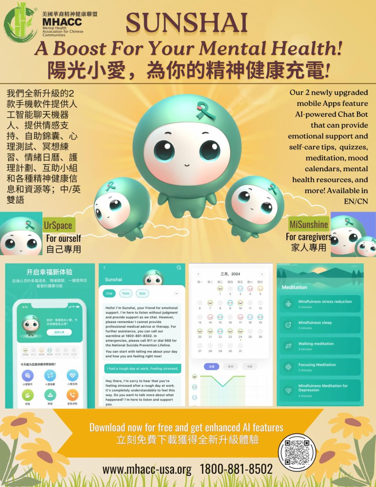 美国华裔精神健康联盟MHACC的免费手机应用程序全面升级,人人可用! UrSpace的阳光小爱是大家的心灵加油站! 24小时的智能聊天、提供即时的情感支持、自助锦囊、心理测试、冥想练习、情绪曲线记录。 阳光小爱,为您带来每日的阳光能量。(扫图中二维码下载)