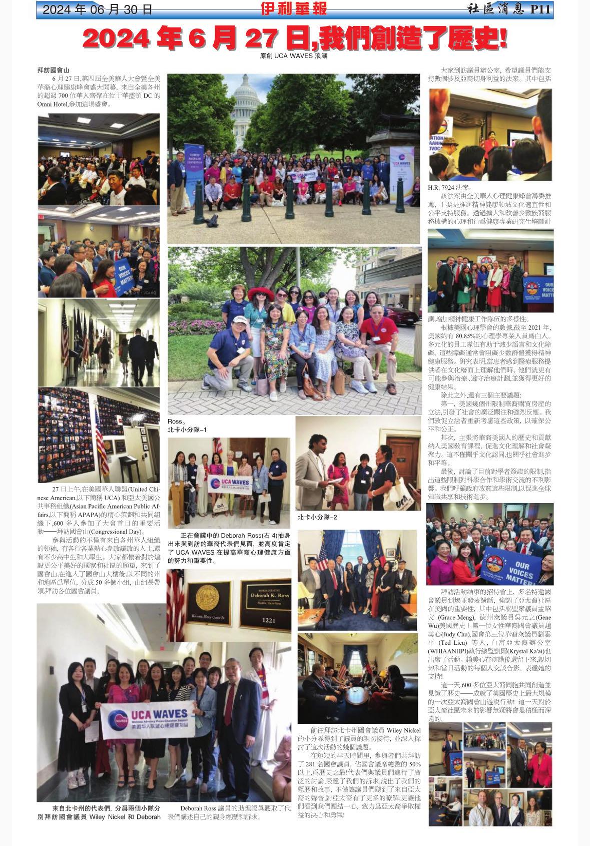 大会第一天(6月27日)是 "国会日",为了呼应本次华人大会的主题“拥抱新时代民权运动”。600多个亚裔社区代表分成50多个小组,访问了281个参众两院议员办公室,占议员总数的50%以上。代表们表达了社区关切的问题,包括精神健康服务、歧视性的限制外国人购房法案,以及将亚裔历史纳入美国历史课程的倡议等。