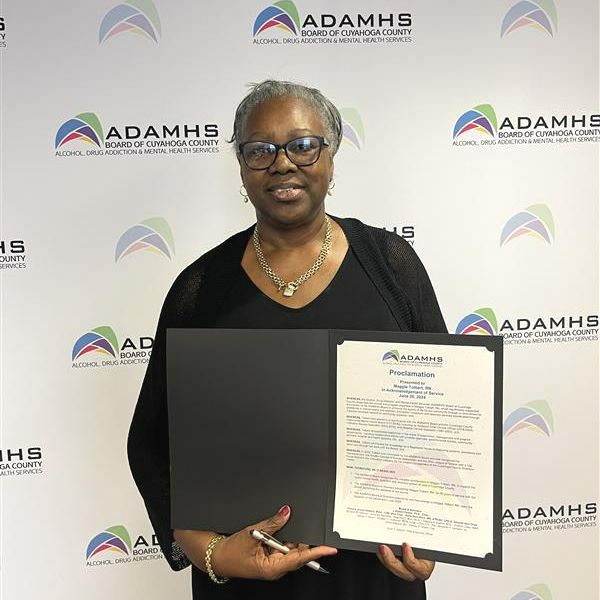 The Board commends Maggie for over 26 years of service. She's held positions of significance with the ADAMHS Board and the Cuyahoga County Community Mental Health Board (CCCMHB), including as Assistant Chief Clinical Officer from 2018 to 2024, Utilization Review Specialist from 2003 to 2018 and Hospital Clinical Specialist from 1997 to 2003. She's excelled in the areas of supervision, management and program responsibility, including collaborative efforts with provider agencies, governmental entities, community partners, hospitals and health systems.