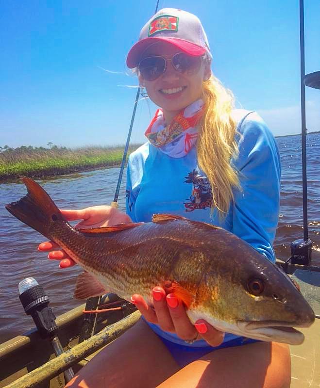 Chaeli Norwood caught a nice redfish while sporting her new Outdoor Addictions hat and buff! (Now sold at Sea Hag Marina.)