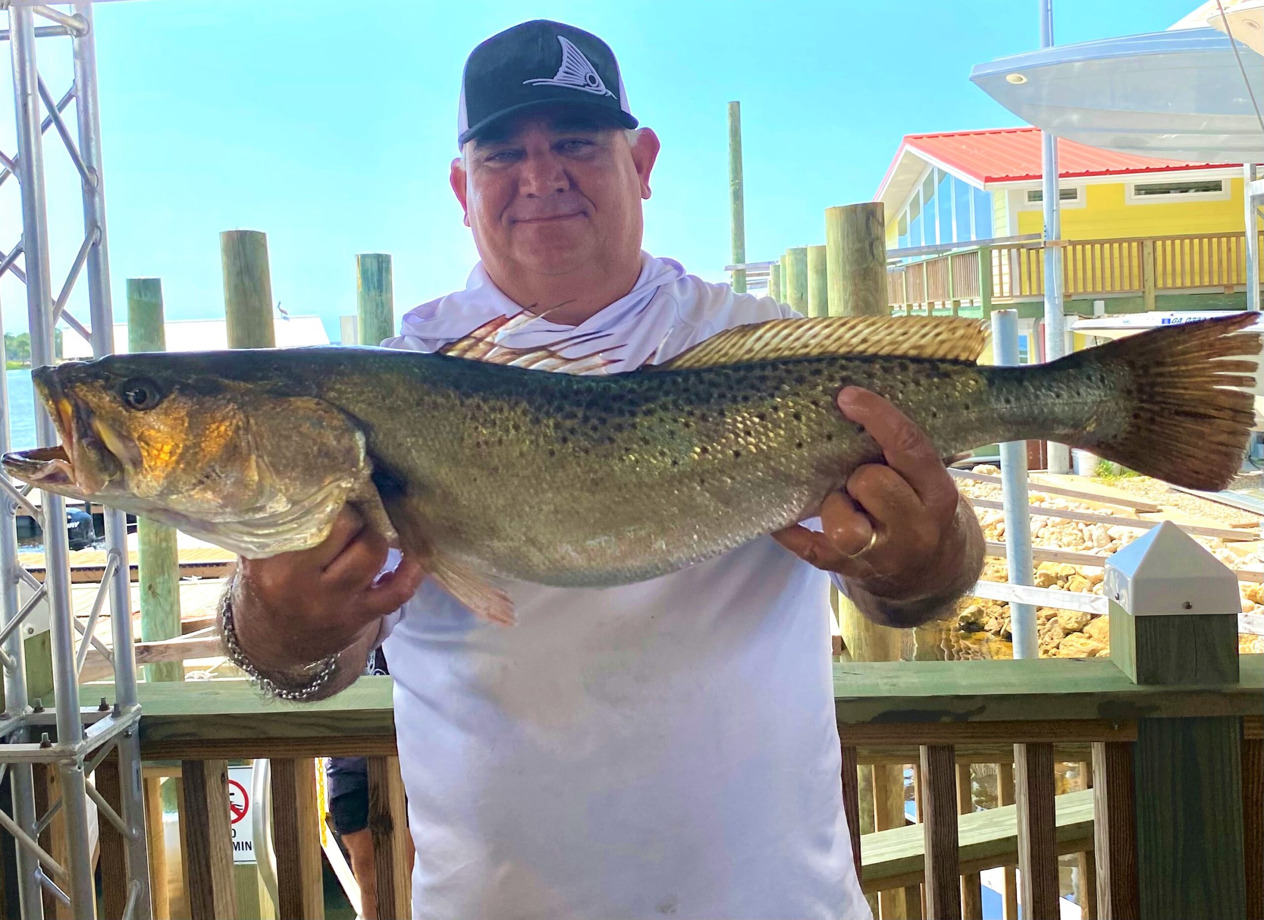| Bradley Phillips is holding up a decent trout he weighed-in. | Jode Hartlein won the Trash Fish Category with his 7.20lb black drum. | Linda Goodbread is holding up a nice trout & Spanish mackerel. | Brennan Haire weighed-in a nice trout & ladyfish. | Steven & Jackson Jones each weighed-in a couple trout. | |