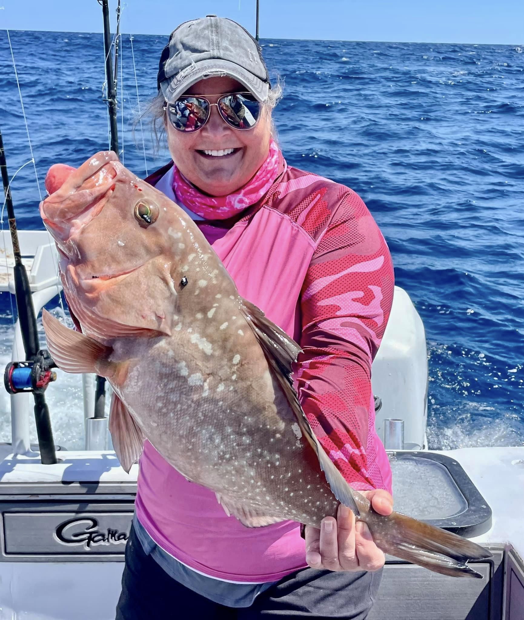 | Jeff Harris is holding up the token, monster scamp grouper, he caught while fishing with the Chase N Fish Crew | This lady landed a stud red grouper with Capt. Jadon Bray! | |