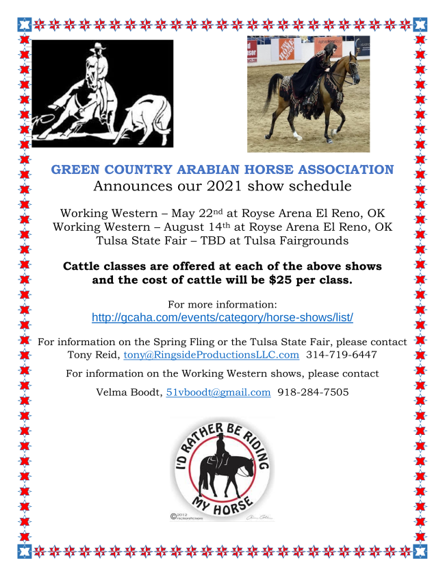 NOTE: The May 8th Green Country Working Western Show has changed date to May 22nd