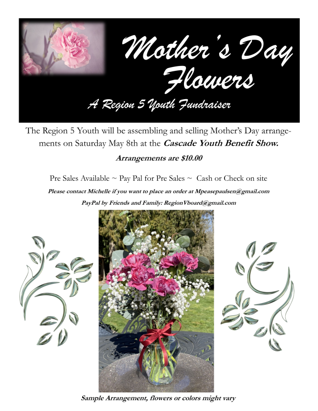 to place your Mother's Day flower order for the Cascade Youth Benefit Show, the fabulous bouquets for mom will be $10, all proceeds will be going to the Region 5 Youth. Contact Michelle Pease - Paulsen for more information.