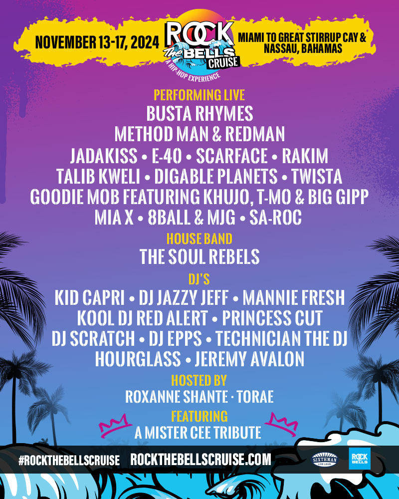 LOS ANGELES, CA – April 26, 2024 – Rock The Bells, the global platform dedicated to elevating Hip-Hop culture from its roots to the modern day, has announced the full line-up of performers joining the second annual “Rock The Bells Cruise: A Hip-Hop Experience", sailing on November 13-17, 2024 from Miami to Great Stirrup Cay and Nassau, Bahamas for another five days of non-stop Hip-Hop.