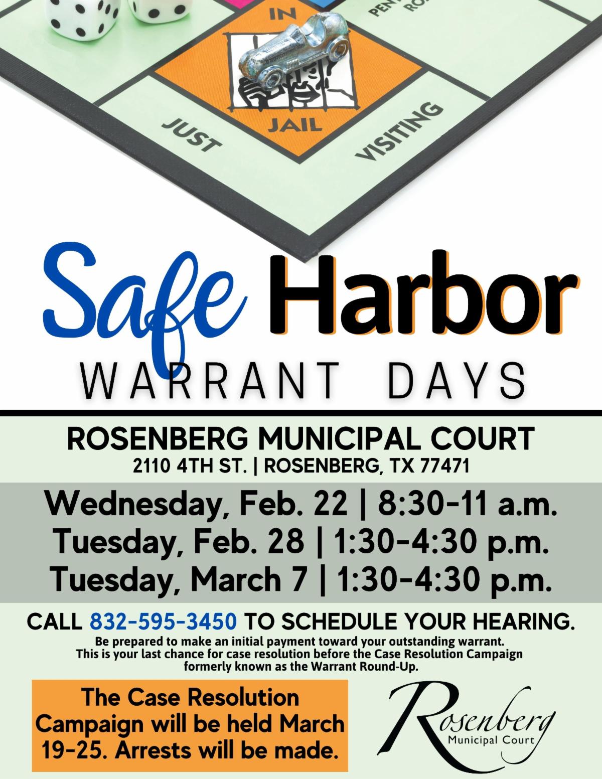 Safe Harbor Warrant Days offers those with outstanding warrants in Rosenberg an opportunity to take care of warrants without the fear of being arrested. This is your last chance before the 2023 Case Resolution Campaign the week of March 19-25. You can avoid arrest by participating in the city of Rosenberg’s Safe Harbor Warrant Days with Rosenberg Municipal Court.