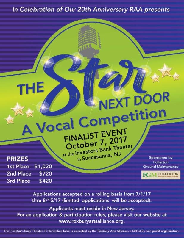 The Roxbury Arts Alliance is celebrating its 20th anniversary this fall! We want to celebrate by hosting a vocal talent competition. We hope that you will join us by competing; voting on-line for your favorite semi-finalist; or attending the Final Event at which the final 12 contestants will perform live on October 7th at the Investors Bank Theater. Judges for the Final Event are music industry professionals.