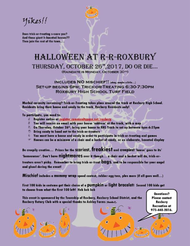 Join Roxbury Recreation on Thursday, October 26th,2017, (Raindate is Monday, October 30th) for Halloween at R-R-Roxbury. Set-up begins 6pm with Trick-or-Treating from 6:30-7:30 pm at the Roxbury High School Turf Field