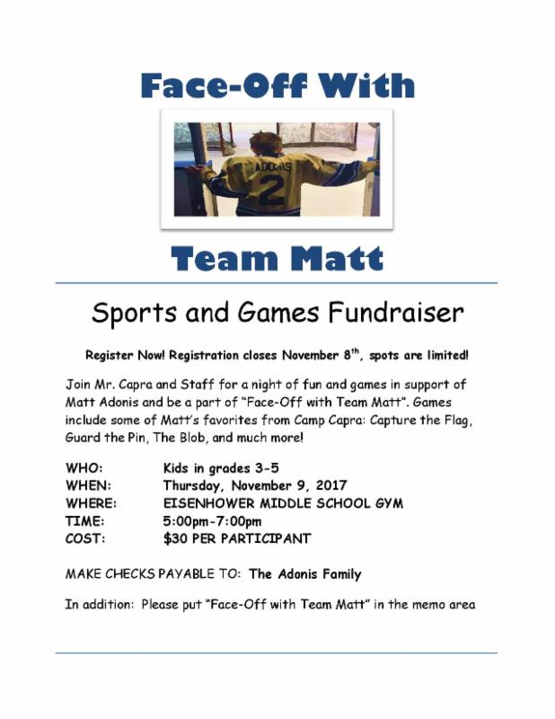 Join Mr. Capra and staff for a night of fun and games in support of Matt Adonis and be a part of "Face-Off with Team Matt". Games include some of Matt's favorites from Camp Capra: Capture the Flag, Guard the Flag, the Blob, and much more!