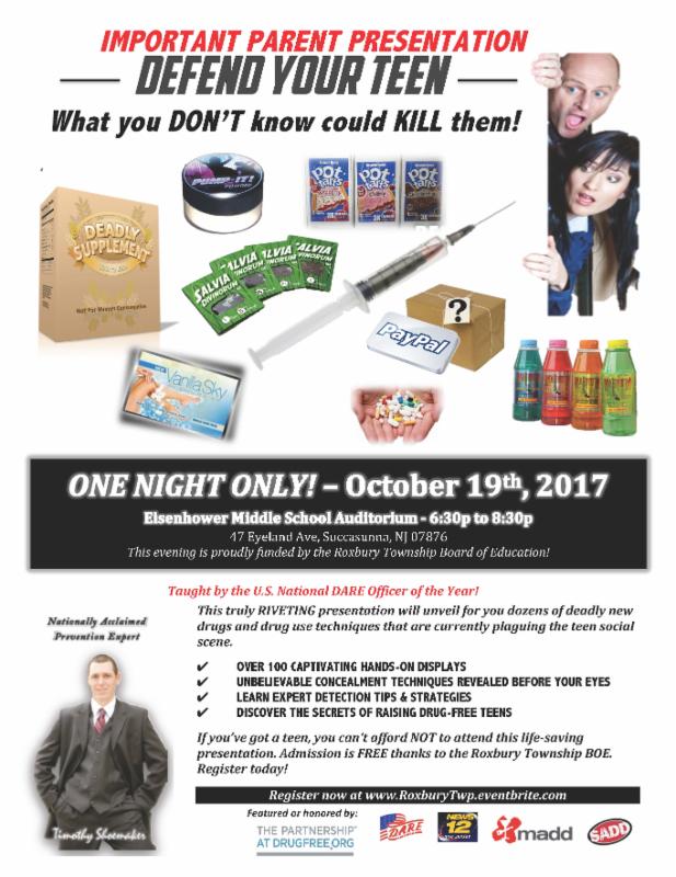 This important parent presentation, taught by the US National DARE Officer of the Year, is one night only on Thursday, October 19th in the Eisenhower Middle School Auditorium at 47 Eyland Avenue in Succasunna, NJ from 6:30-8:30 p.m.
