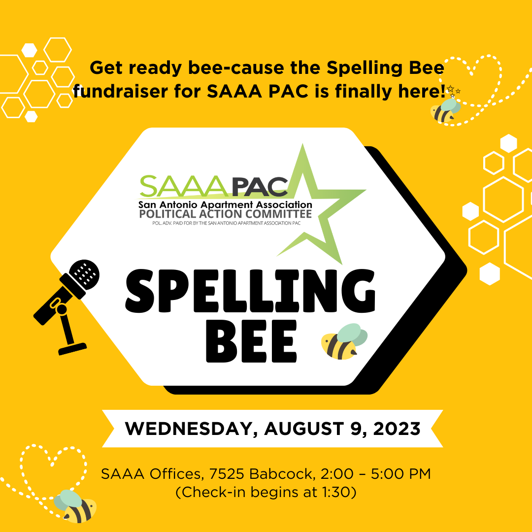 Bring your A-game, rally up your friends, and get ready to dazzle the crowd with your spelling skills. We are seeking teams of four, with one member designated as the speller, to participate in a fun spelling bee that will help raise funds for the SAAA PAC Fund. Every dollar raised goes towards the apartment association's advocacy mission, which aims to influence government at every level for the betterment of the rental housing industry.