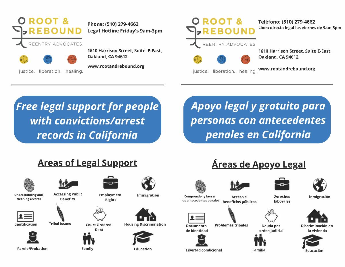 Root and Rebound works to support people navigating reentry and reduce the harms perpetuated by mass incarceration. In addition to other services, they provide free legal support for people with convictions/arrest records in California.