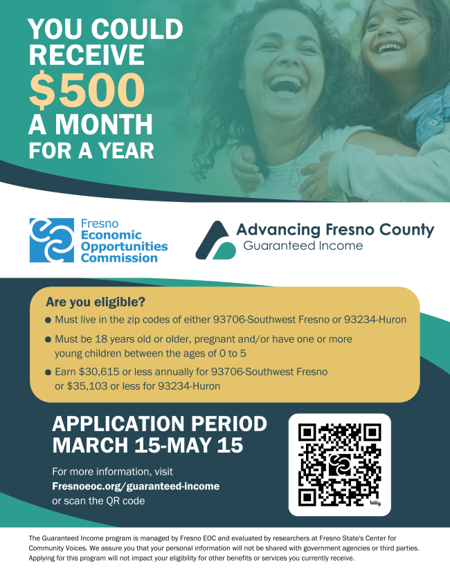For more information, visit Fresnoeoc.org/guaranteed-income or click the QR code on the flyer.