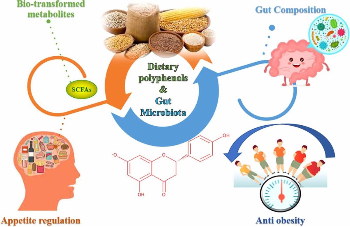 Nowadays, due to the rise of fast-food consumption, the metabolic diseases are increasing as a result of high-sugar and high-fat diets. Therefore, there is an urgent need for natural, healthy and side-effect-free diets in daily life. Whole grain supplementation can enhance satiety and regulate energy metabolism, effects that have been attributed to polyphenol content. Dietary polyphenols interact with gut microbiota to produce intermediate metabolites that can regulate appetite while also enhancing prebiotic effects. This review considers how interactions between gut metabolites and dietary polyphenols might regulate appetite by acting on the gut-brain axis. In addition, further advances in the study of dietary polyphenols and gut microbial metabolites on energy metabolism and gut homeostasis are summarized. This review contributes to a better understanding of how dietary polyphenols regulate appetite via the gut-brain axis, thereby providing nutritional references for citizens' dietary preferences.