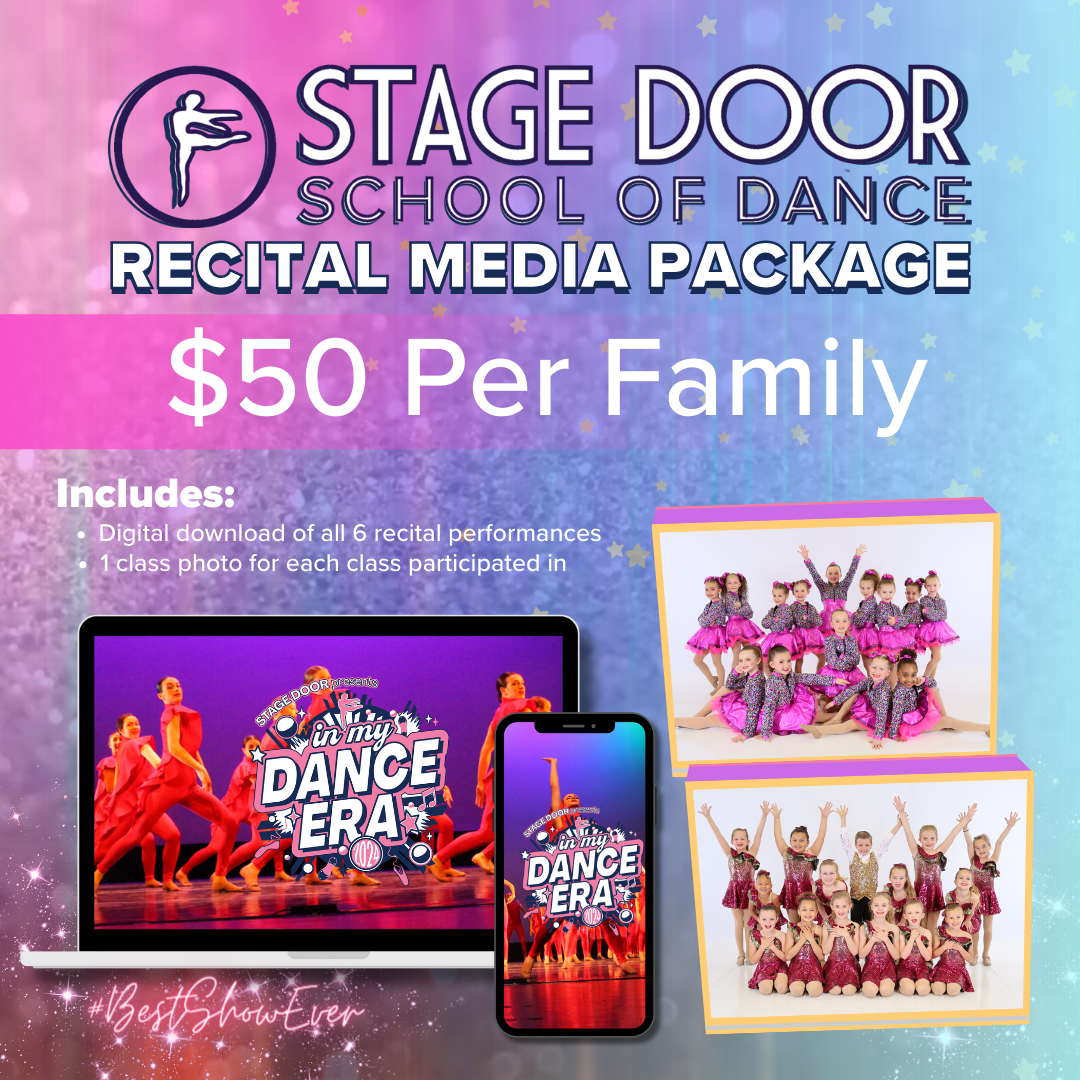 Speaking of the recital, we have even more exciting recital news to share! Stage Door is always listening, and we definitely heard you! Gone are the days of recital DVDs! We are excited to introduce the Recital Media Package, which grants all recital families digital access to all six shows for the very first time. We are so excited to upgrade your recital experience and now make it even easier for your entire family to enjoy watching your dancer shine, no matter where they are in the world! But that's not all; families will also receive a digital class photo of every single class your dancer performs with, all for a flat rate that's a fraction of past prices. Read more about this exciting package below!