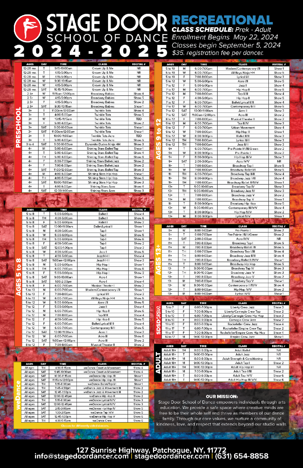 As always, we're here to answer any questions you may have about our programs or the upcoming season. Please always feel free to reach out to us at info@stagedoordancer.com, call (631) 654-8858, or visit us at the studio front desk for more information.