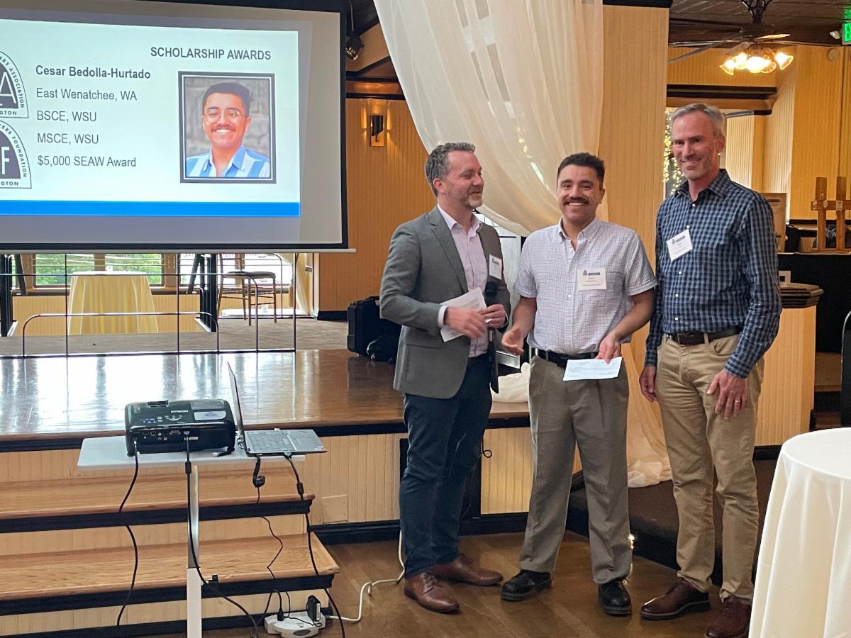 SEAW Scholarship Committee Chair Kevin Solberg (L) and SEFW Vice Chair Cale Ash (R), present a student with an SEAW Scholarship in 2023. Photo courtesy SEFW. | |
