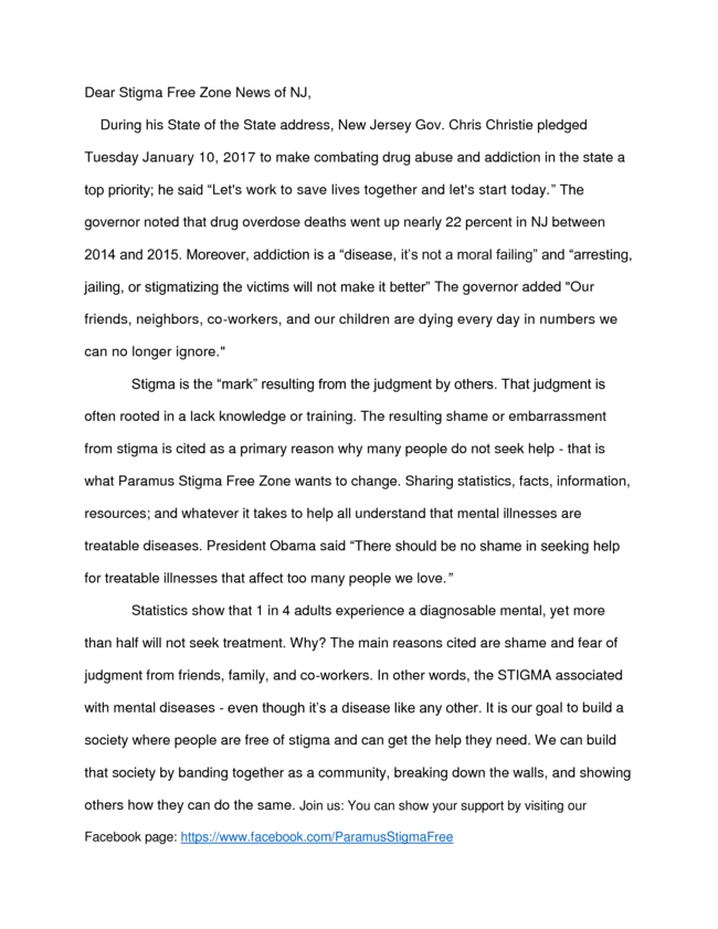 According to MHA Passaic, Associate Director, Rebekah Leon, "Mental Health Association, Passaic is following Bergen's lead on the Stigma Free Zone. Our goal is to get the entire county to go Stigma Free". She added "Bergen County is our example."