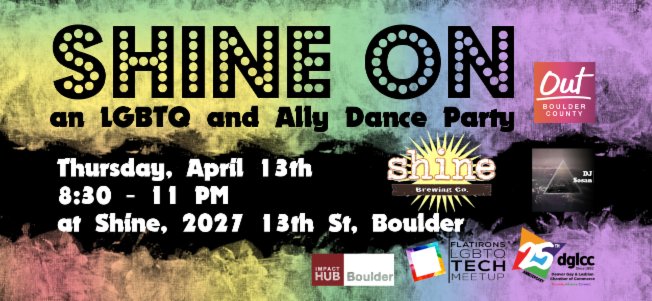 Out Boulder County is teaming up with DJ Sosan, the Flatirons LGBTQ Tech Meetup, Impact Hub Boulder, The Denver Gay and Lesbian Chamber of Commerce, and Shine to throw another Queer Dance Party celebrating our community.
