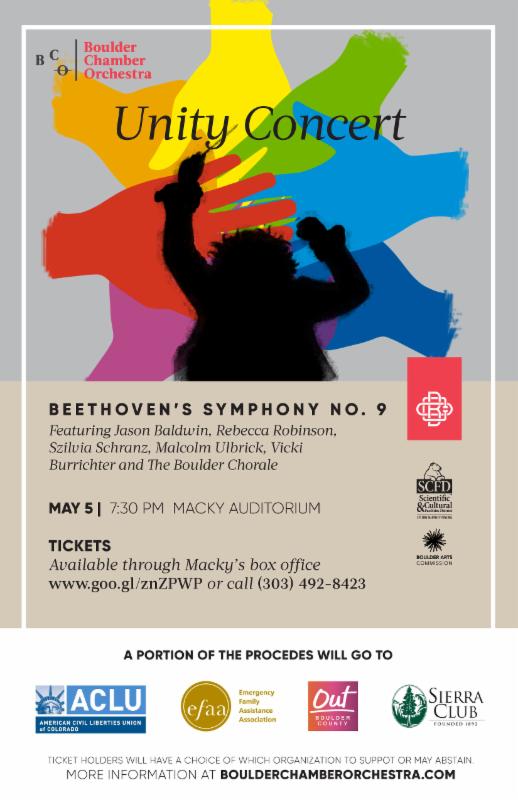 Beethoven 9 "Unity Concert" - The Boulder Chamber Orchestra is proud to feature Beethoven's 9th Symphony as a Unity Concert for the benefit of four local nonprofit organizations. Experience the wonder of the 9th Symphony and support local nonprofits the ACLU, Out Boulder County, The Sierra Club, and EFAA.