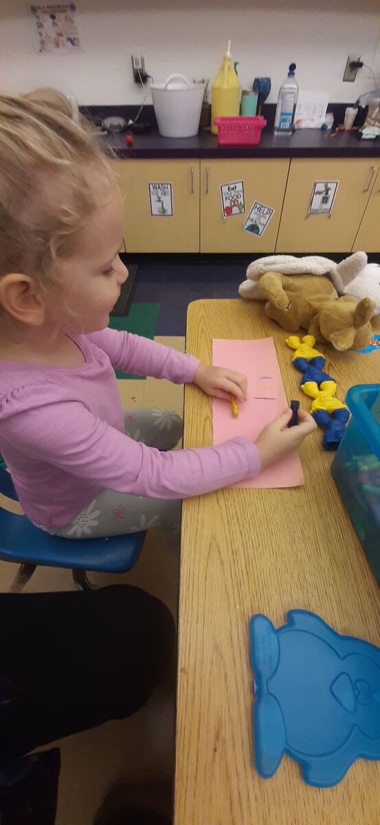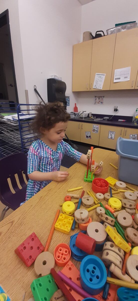 The class is working hard during manipulative play when children are enhancing fine motor skills, eye-hand coordination, and visual discrimination. In this case we are also patterning. Patterns are not only fun to make but they help children learn to make predictions, to understand what comes next, to make logical connections, and to use reasoning skills. Some children followed patterns they made with crayons or matching up the toys with the colors they wrote out. | |