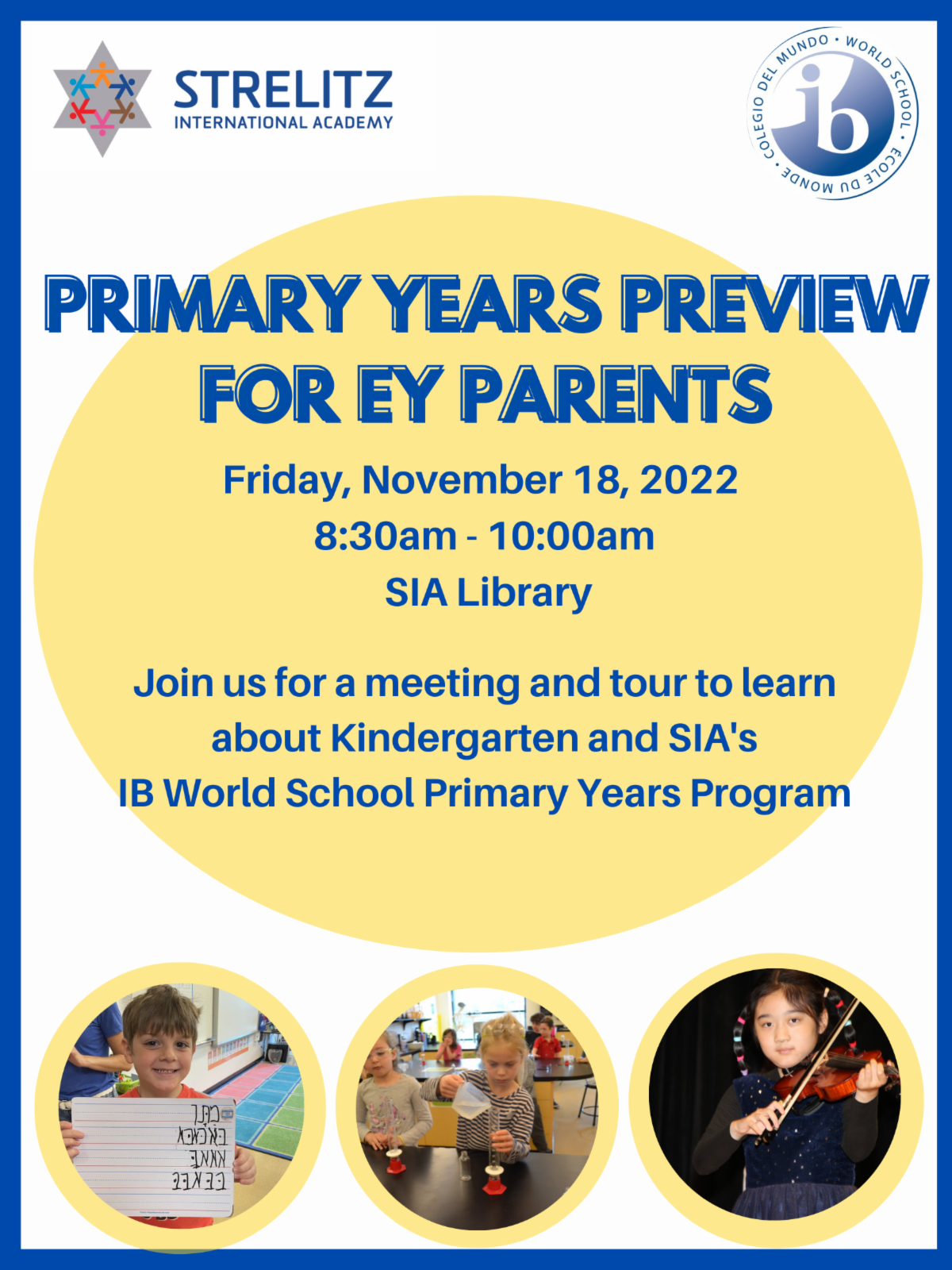 Please join us for our Primary Years Preview, this Friday, November 18, 2022 at 8:30am to learn more about Kindergarten through Fifth grade at SIA! For more information, please see ParentSquare or email Carin Simon..